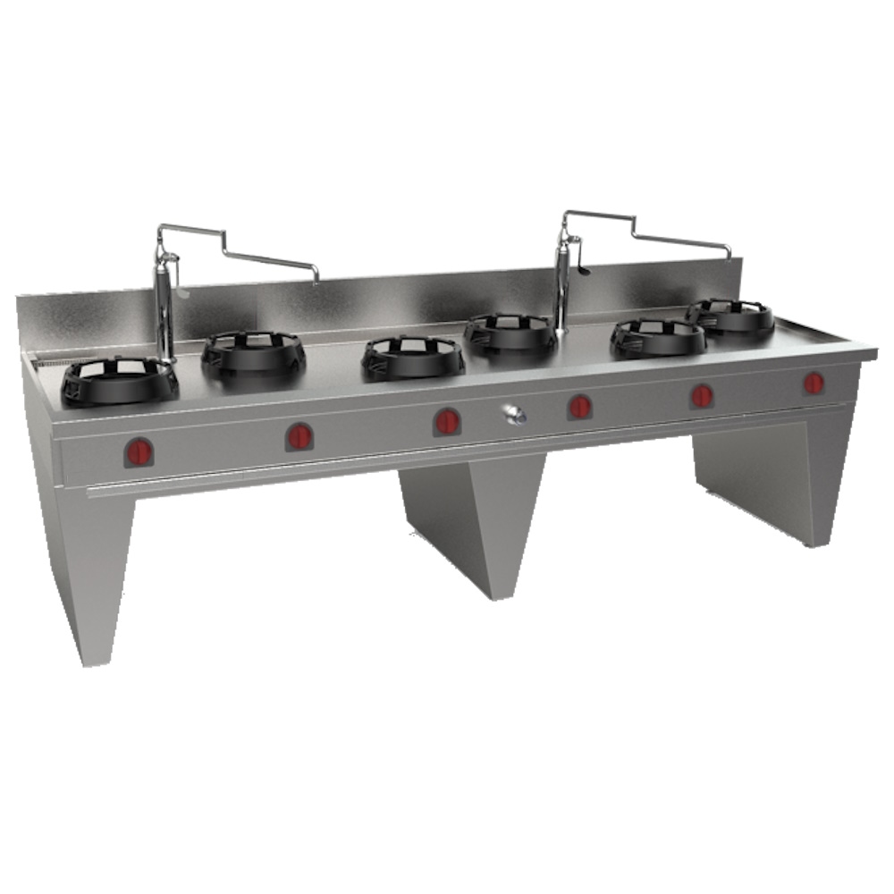 EURAST - Gekühltes wok mit 6 gasbrennern 2 träger, 2 wassersäulen - 3000x900x850 mm - 105 Kw - 32309DEM