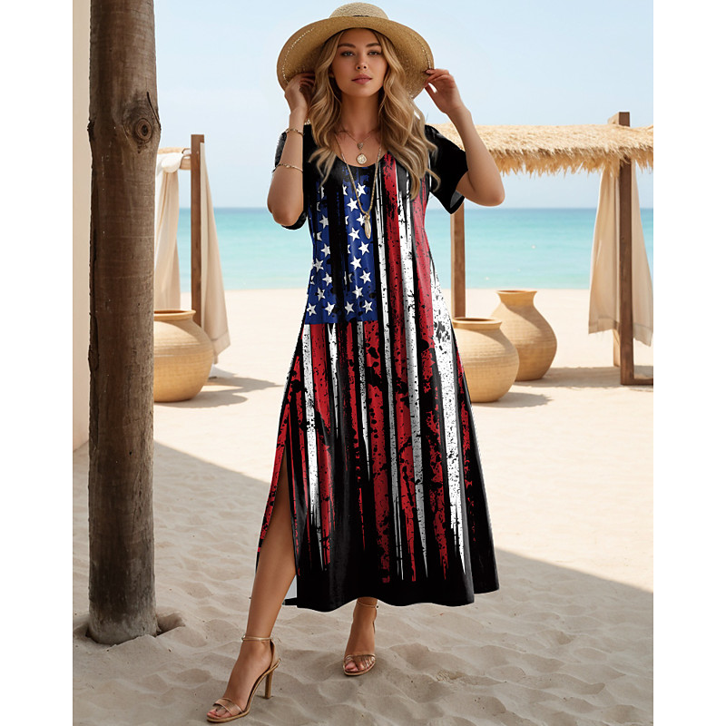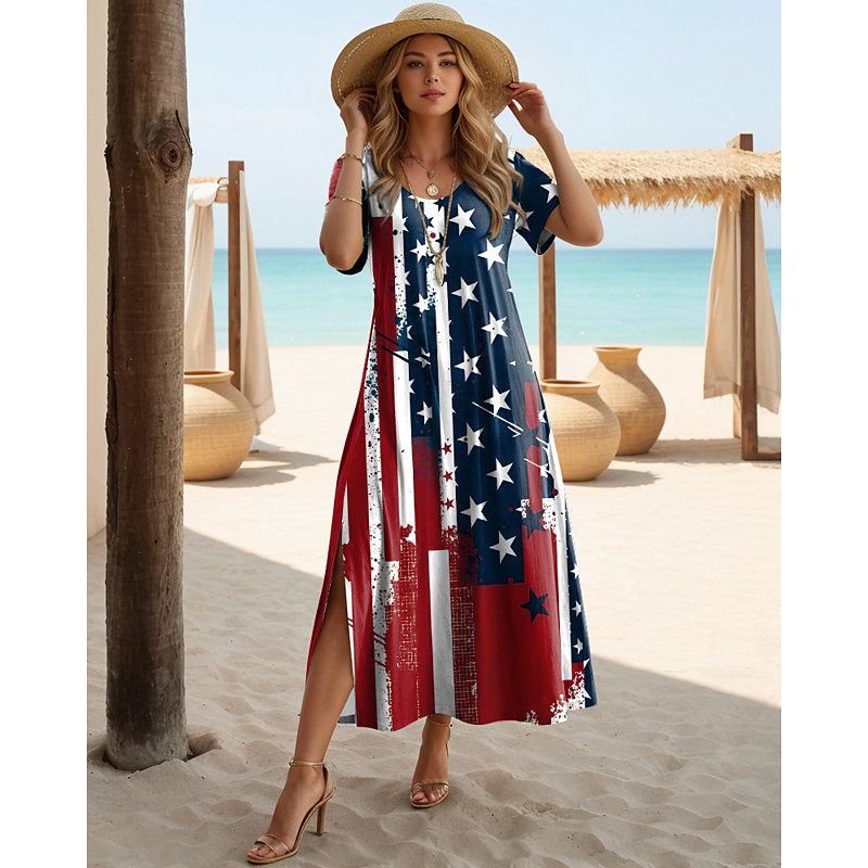 Women's Patriotic Maxi Dress Long Sleeve Boho Dress Elegant Vintage Butterfly Sleeve Vacation Beach Regular Fit Flag Vintage Short Sleeve Crew Neck Blue Summer