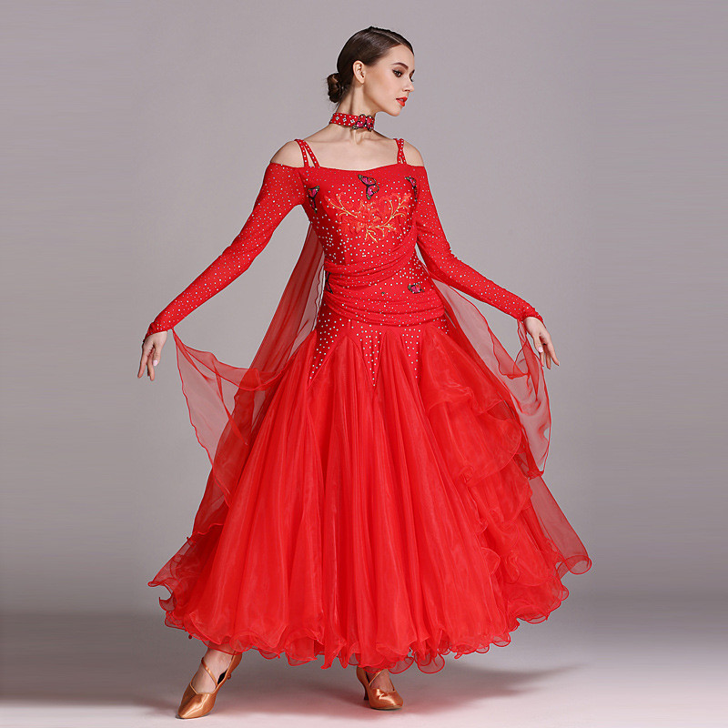 Women's Ballroom Dance Dress Butterfly Embroidered Rhinestone Layered Tulle Elegant Waltz Tango Foxtrot Competition Performance Gown – Sky Blue