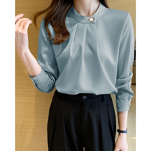 Per donna Camicia Elegant Elegante Raso/Satin Semplice Elegante Formale Manica Lunga Scollo a V Top Regolari Lavoro Uscire Arricciato Bottoni Bianco Champagne Blu Grigio Primavera Autunno