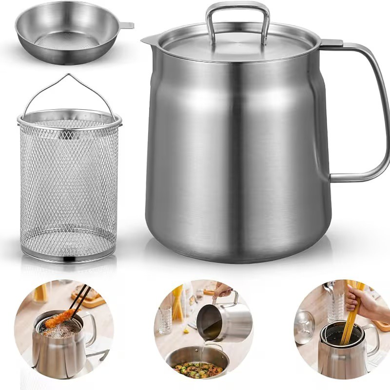 304 Stainless Steel Large Capacity Oil Filter Pot with Frying Basket – Multi-Functional Kitchen Cooking Tool for Efficient Oil Filtration, Ergonomic Handle, and Even Pour Spout, Ideal for Home Kitchen