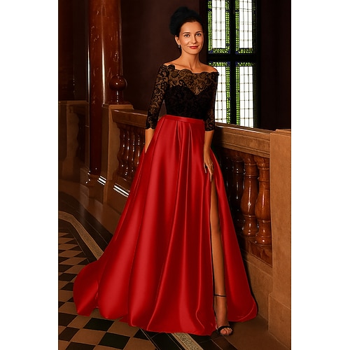 Linea ad A Lunghezza al pavimento Abito da Sera Da principessa Abito formale Elegante Spacco Alto Setoso Manica 3/4 Scollo Illusione Matrimonio Formale Tasca Raso Pizzo con Tasca