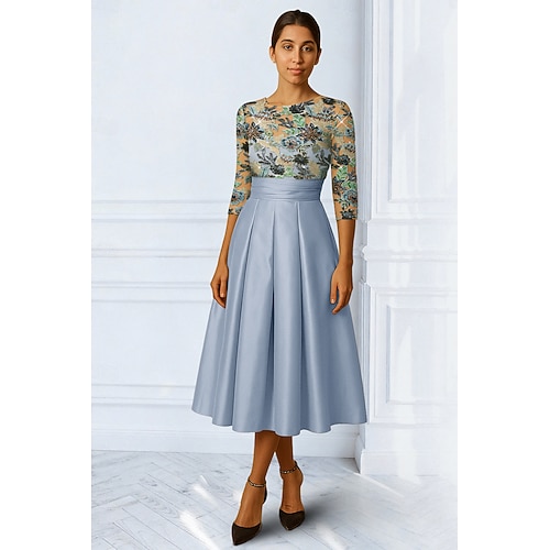 Linea ad A Lunghezza Tè Vestito da Festa Abito da Cocktail Abito da invitata a nozze Abito da cerimonia per signora Manica 3/4 Scollo Tondo Elegante Festa Formale Ospite di nozze Raso Pizzo con
