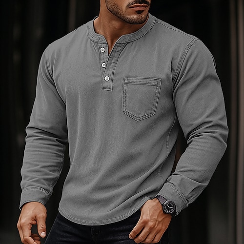 Per uomo Maglia Henley Camicia 100% cotone lavaggio acido Manica Lunga Henley Primavera Autunno Tutte le stagioni Vintage Retrò Vintage Casual Tasca Stile Vintage Lavato Casuale Nero Caffè Rosa
