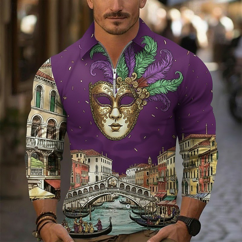 Men's Polo Polo Shirts Daily Carnival Lapel Long Sleeve Fashion Hawaiian Graphic Mask Printing Quarter Zip Spring Fall Tailored Fit Deep Purple Light Purple Purple Dark Purple Polo