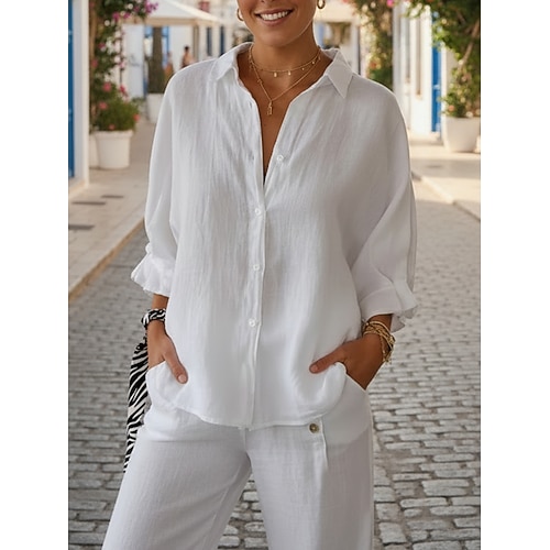 Per donna Moda Streetwear Camicia Set di biancheria in cotone Set di Pantaloni Manica Lunga Colletto a Camicia Semplice Casuale Quotidiano All'aperto Bianco Rosa Verde militare Primavera Vestibilit