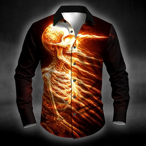 Camicia da uomo Costumi Scheletro Fiamma Camicia Button Up Maniche Lunghe Stile Punk Gotico Scuro Attività Outdoor Vacanza Estate Primavera Colletto Turndown Camicie Stampate 3D Nera