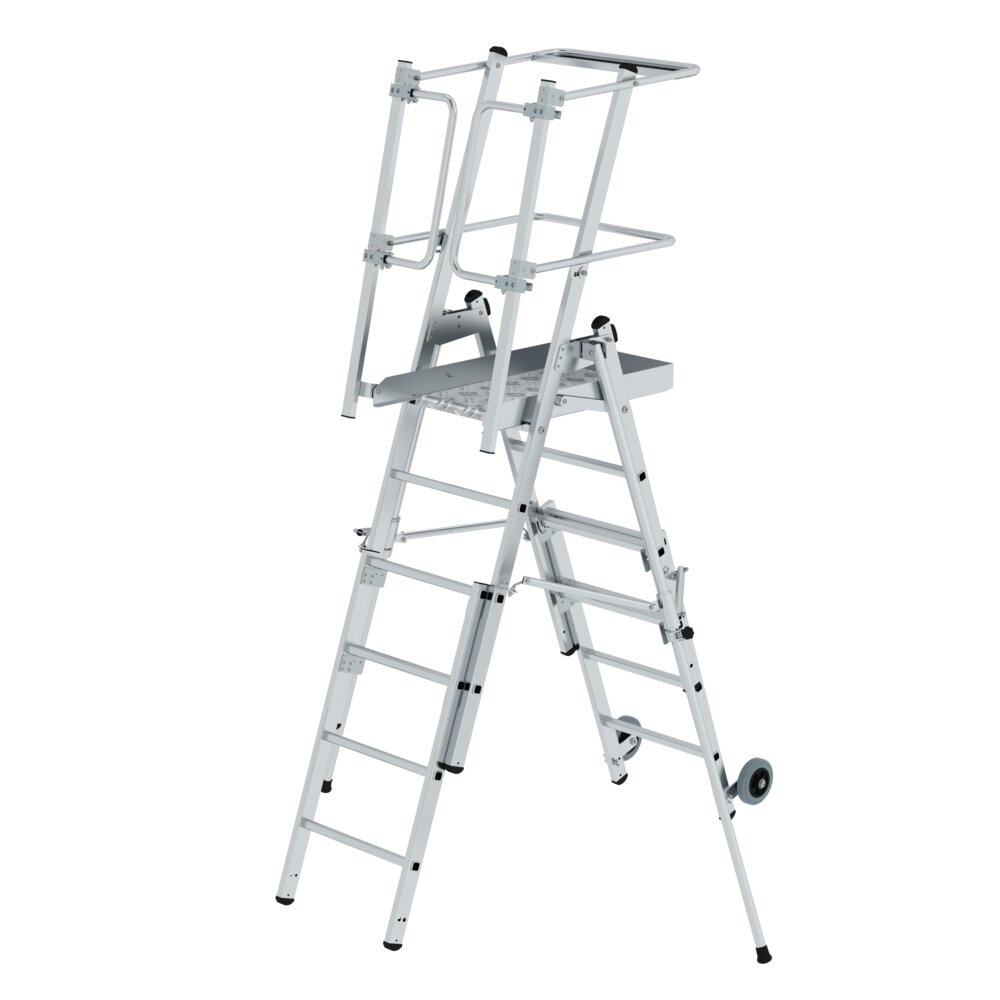PROREGAL Plattformleiter FlexxStep | 4 Sprossen | mit Teleskopaufsatz plus 2 Sprossen & beidseitigem Handlauf | Aluminium | Rutschsichere Leiterschuhe