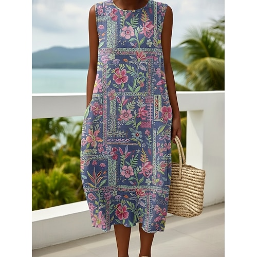 Per donna Abito Midi Vestito Casual Vestito Estivo Abito a Tubino Vintage Quotidiano All'aperto Vacanza Vestibilità comoda Floreale Senza Maniche Girocollo Blu Estate Primavera