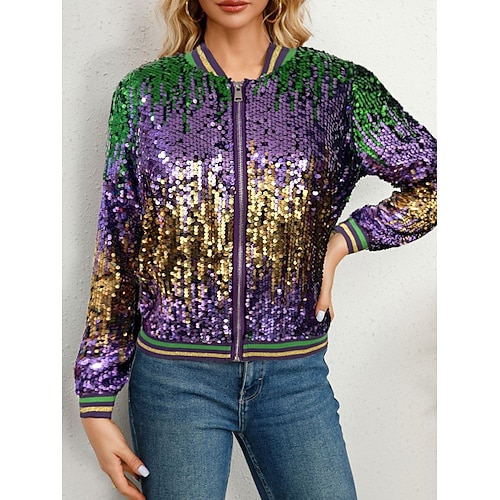 Giacca bomber da donna Carnival Giacca Casual Comoda Traspirante Cerniera Paillettes Casual Blocco di Colore Vacanza Festa Cerniera Collo alzato Vestibilità Regolare a maniche lunghe esterno viola