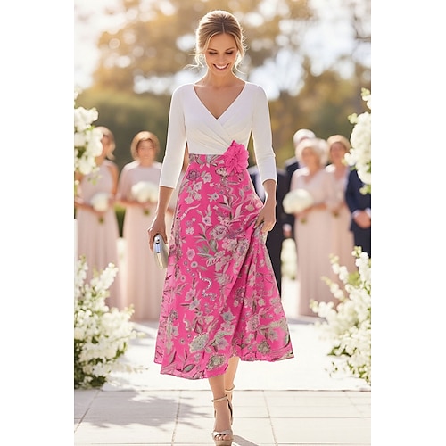 Linea ad A Lunghezza Tè Vestito da Festa Abito da Cocktail Abito da invitata a nozze Abito da cerimonia per signora Manica 3/4 Scollo a V Elegante Casual Formale Jacquard Crepe Elasticizzato con