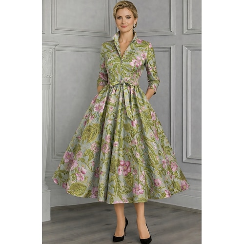 Linea ad A Lunghezza Tè Vestito da Festa Abito da Cocktail Abito da invitata a nozze Abito da Sera Elegante Vintage Manica 3/4 Colletto a Camicia Matrimonio Formale Jacquard con Tasca