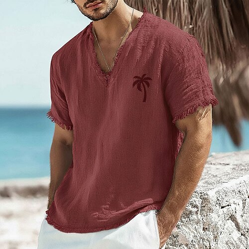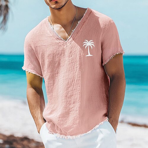 Herren-T-Shirt mit kleinem Palmenprint aus Leinen-Baumwoll-Mischgewebe, V-Ausschnitt, offene Kanten, altrosa, sommerliches Strandurlaubs-Shirt mit Fransen, weiches Designer-Top, Größen S-3XL