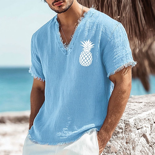Herren-T-Shirt mit Palmenprint aus Leinen-Baumwoll-Mischgewebe, V-Ausschnitt, offene Kanten, altrosa, sommerliches Strandurlaubs-Shirt mit Fransen, weiches Designer-Top, Größen S-3XL
