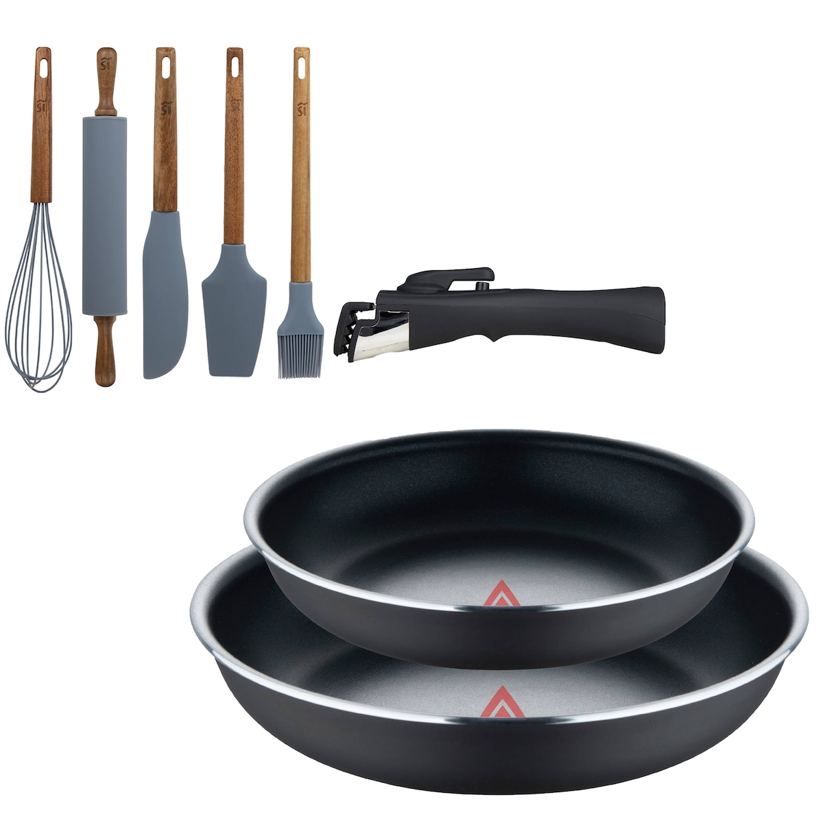 BERGNER - Set aus 2 Pfannen Ø22/26 cm gepresstes Aluminium Schwarz mit abnehmbarem Griff mit Set aus 5 Küchenutensilien aus Silikon und Akazienholz
