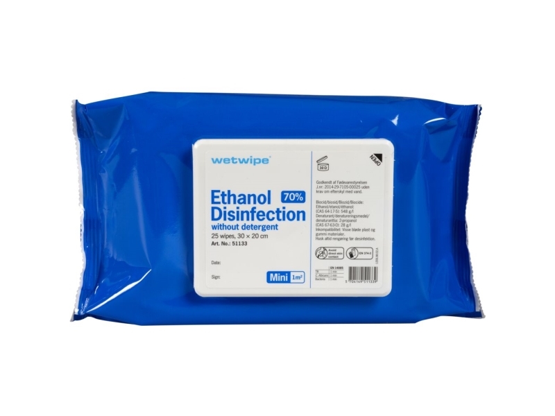 Overflatedesinfeksjon, våtservietter, mini, 30x20 cm, 70 % etanol, uten såpe, med 25 stk.