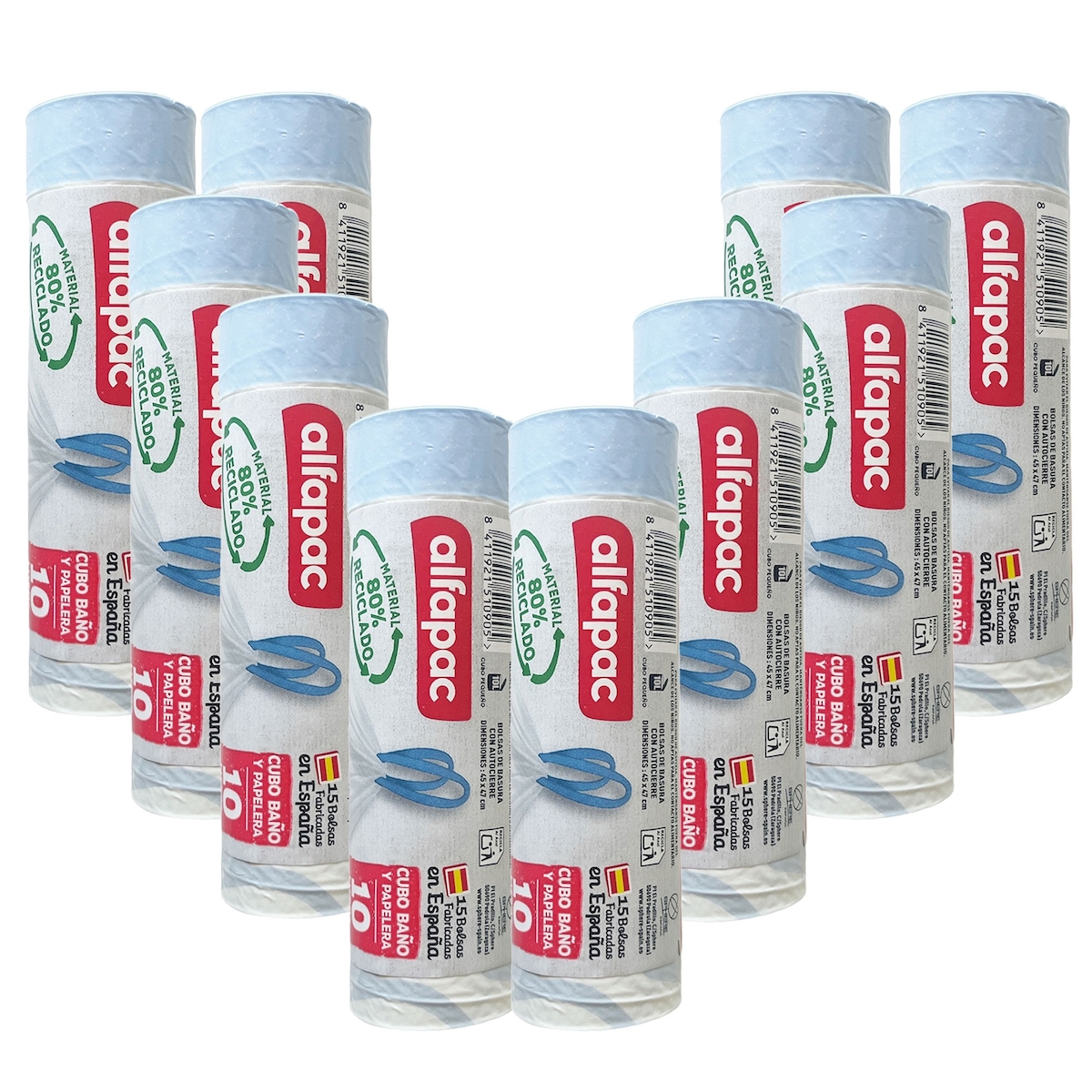 Alfapac - Müllbeutel 10L 45X57cm mit Selbstverschluss, 10 Rollen x 15 Stück (80% Recycelt)