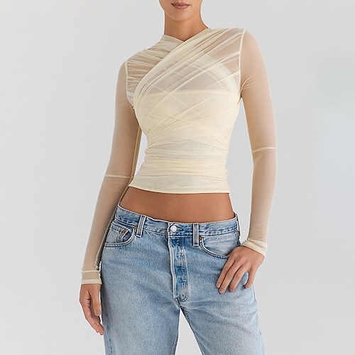 Per donna Blusa Top Eleganti Top attillati Semplice Elegante Vintage Quotidiano Manica Lunga Girocollo Top corti Lavoro Quotidiano Ferie Arricciato Rete Nero Verde militare Albicocca Estate Primavera