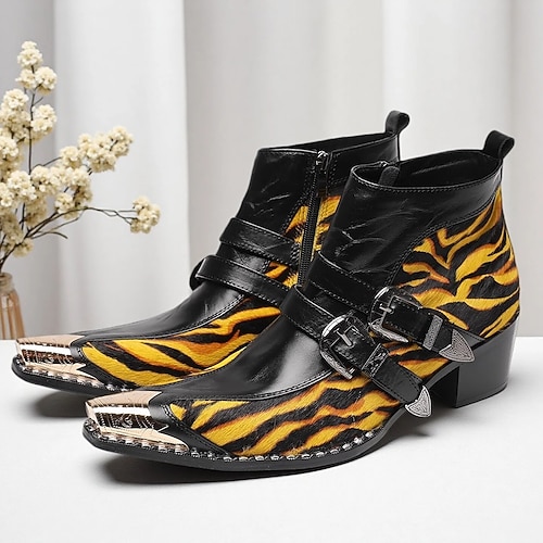 stivaletti da uomo in pelle con stampa tigre nera e gialla e design a doppia fibbia: calzature audaci e alla moda per feste, serate fuori e occasioni alla moda
