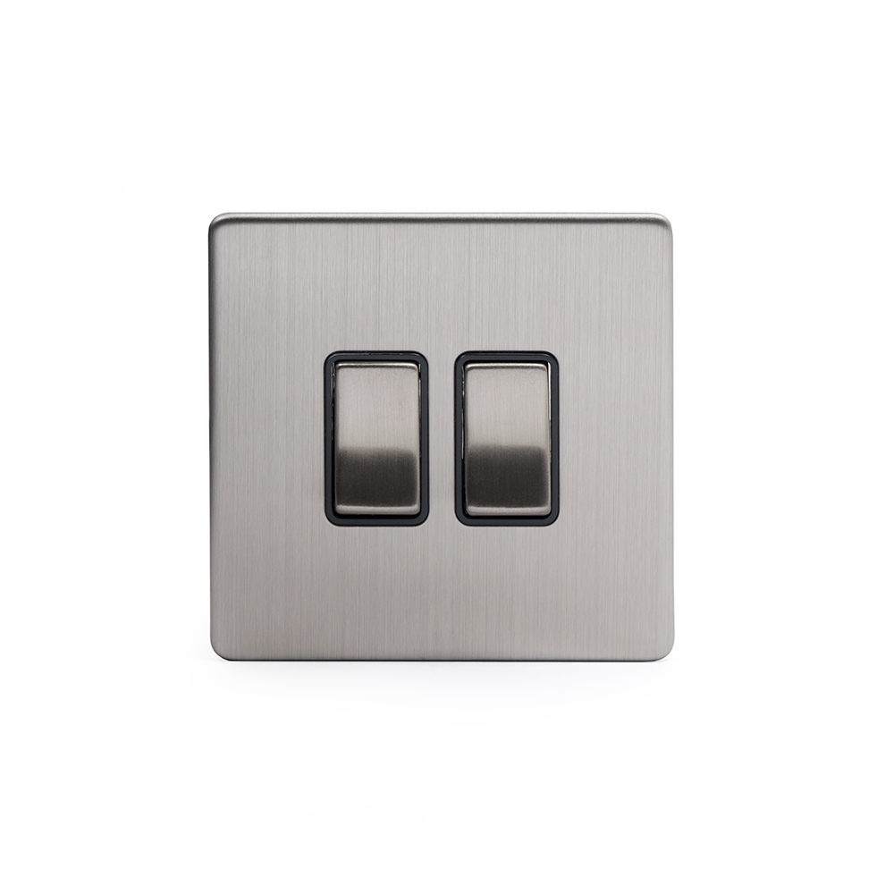 Brushed Chrome 10A 2 Gang 2 Way Switch with Black Insert Screwless - Size: 86mm x 86mm x 4.5mm - The Soho Lighting Company
