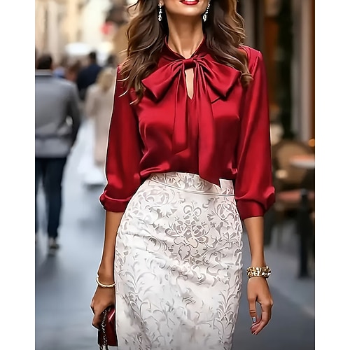 Per donna Camicia Elegant Elegante Raso/Satin Tinta unica Elegante Essenziale Casual Manica Lunga Cravatta al collo Collo Alto Top Regolari Quotidiano Uscire Fiocco Rosso Primavera Autunno