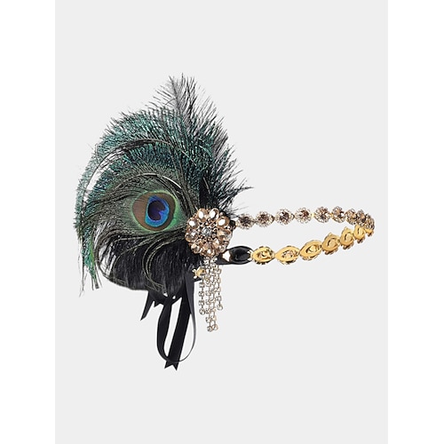 Cerchietto per capelli da donna anni '20 con piume e perline dorate e catene di strass - accessorio per capelli vintage in stile flapper per le feste Gatsby