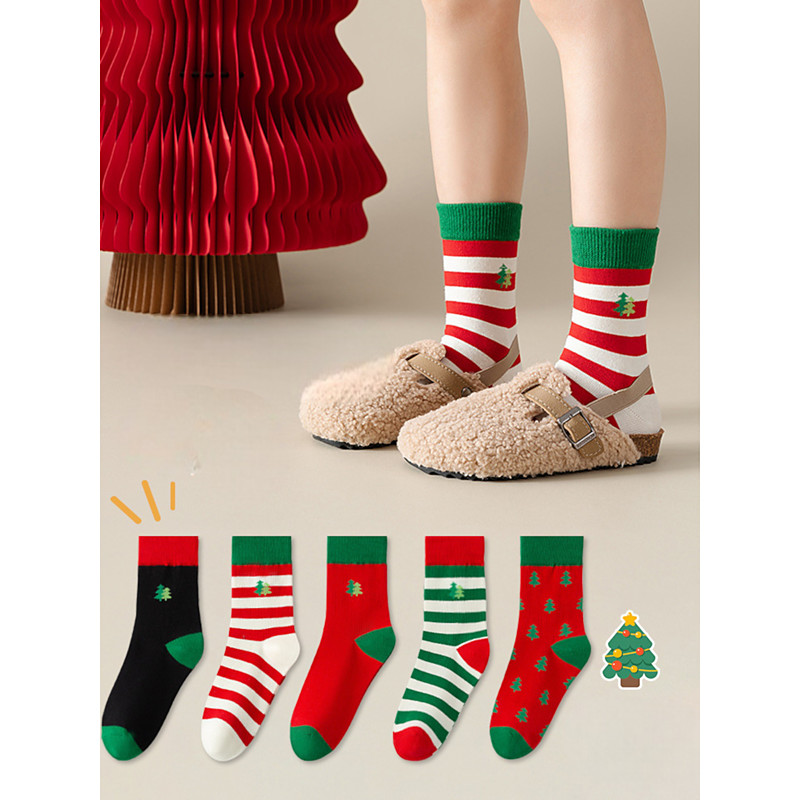 Women's Christmas Socks Set, 5 Pairs with Holiday Tree and Striped Designs, Red, Green White, Perfect for Christmas Gifts