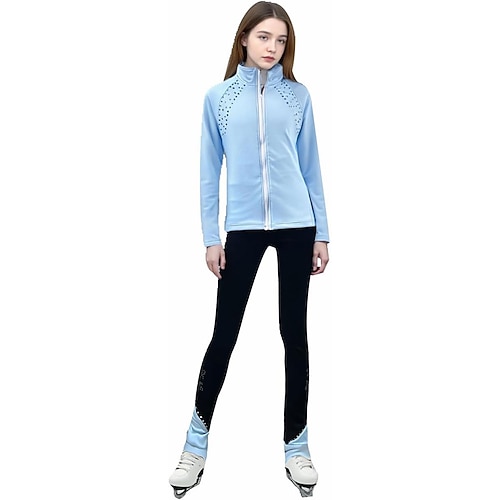 giacca da pattinaggio artistico con pantaloni da donna e da ragazza, pantaloni da pattinaggio sul ghiaccio, leggings, abiti, pile azzurro cielo, spandex elasticizzato, allenamento, competizione,