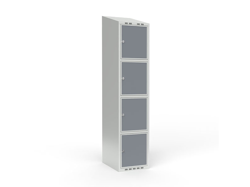 Skoleskab 1x300 Skråt tag 4 rum i højden Lys grå laminatdør Greb for hængelås