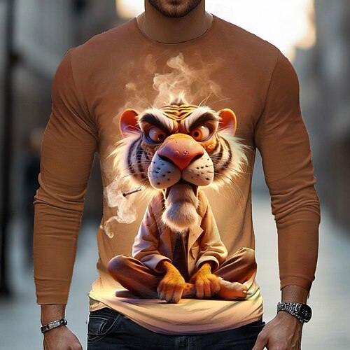 Herren Tiger 3D Lustig T Shirt Langarm T-Shirt 3D-Druck Rundhalsausschnitt Hemd Mode Basic Straße Lässig Täglich Dunkelbraun Braun Sommer Frühling Bekleidung S M L XL XXL XXXL