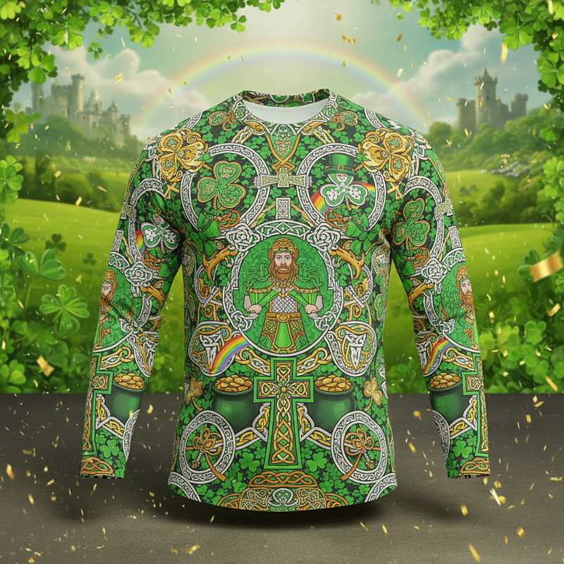 St. Patrick's Day Long Sleeve T-Shirt for Men Lucky Irish Clover Shamrock Graphic Tee 3D Print Crew Neck St. Paddy's Day Top