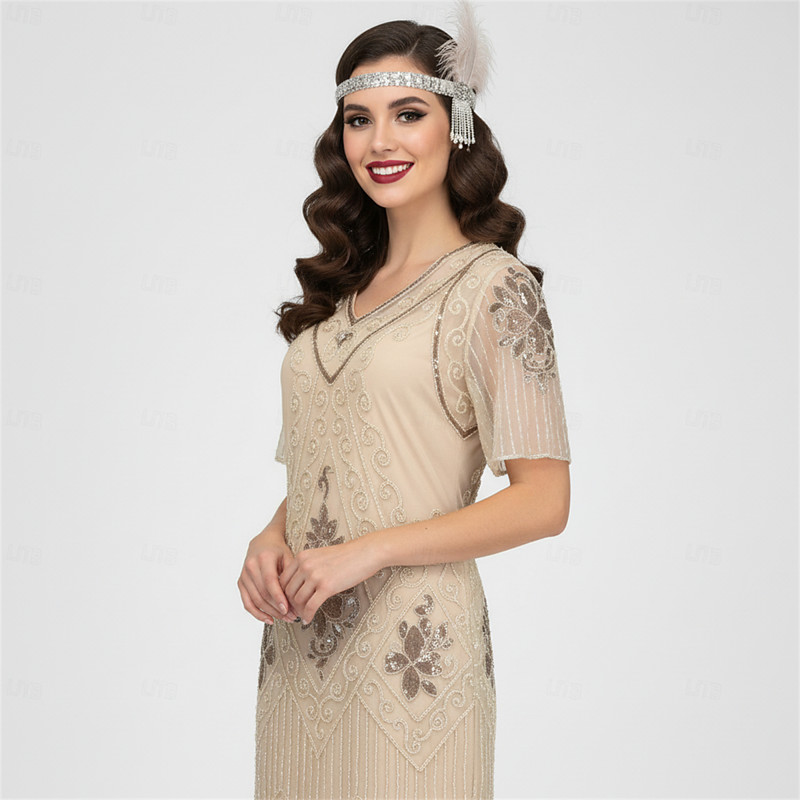 Roaring 20s 1920s Cocktail Dress Ankle Length Dress Prom Dress Christmas Party Dress Normal Short Sleeves The Great Gatsby Charleston Wedding Guest Sequins V Neck Fancy Dress Women's Carnival