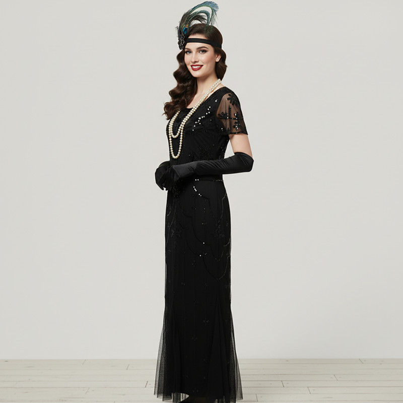 Set Retro Vintage Roaring 20s 1920s Floor Length Outfits Accessories Set Evening Dress with Accessories Short Sleeves The Great Gatsby Wedding Guest Sequins Sequin V Neck Fancy Dress Women's Carnival