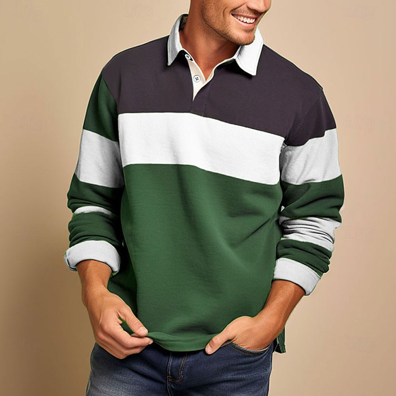Men's Striped Rugby Polo Shirts Long Sleeve Polo Shirts Collar Business Casual Formal Outdoor Dailywear Buttons 3D Print Spring Fall Winter Blue Green Army Green