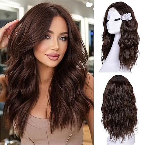 Kurze, gewellte Perücken für Frauen, schwarze Bob-Wellenperücke, natürlich aussehendes synthetisches Mittelteil, Spitzenfronthaar für die alltägliche Frisur, 18 Zoll