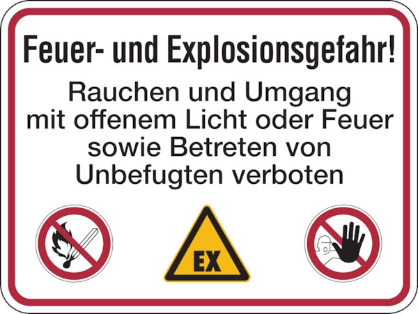 Hinweisschild, Feuer- u. Explosionsgefahr! - 400 x 300 x 0.6 mm Aluminium geprägt