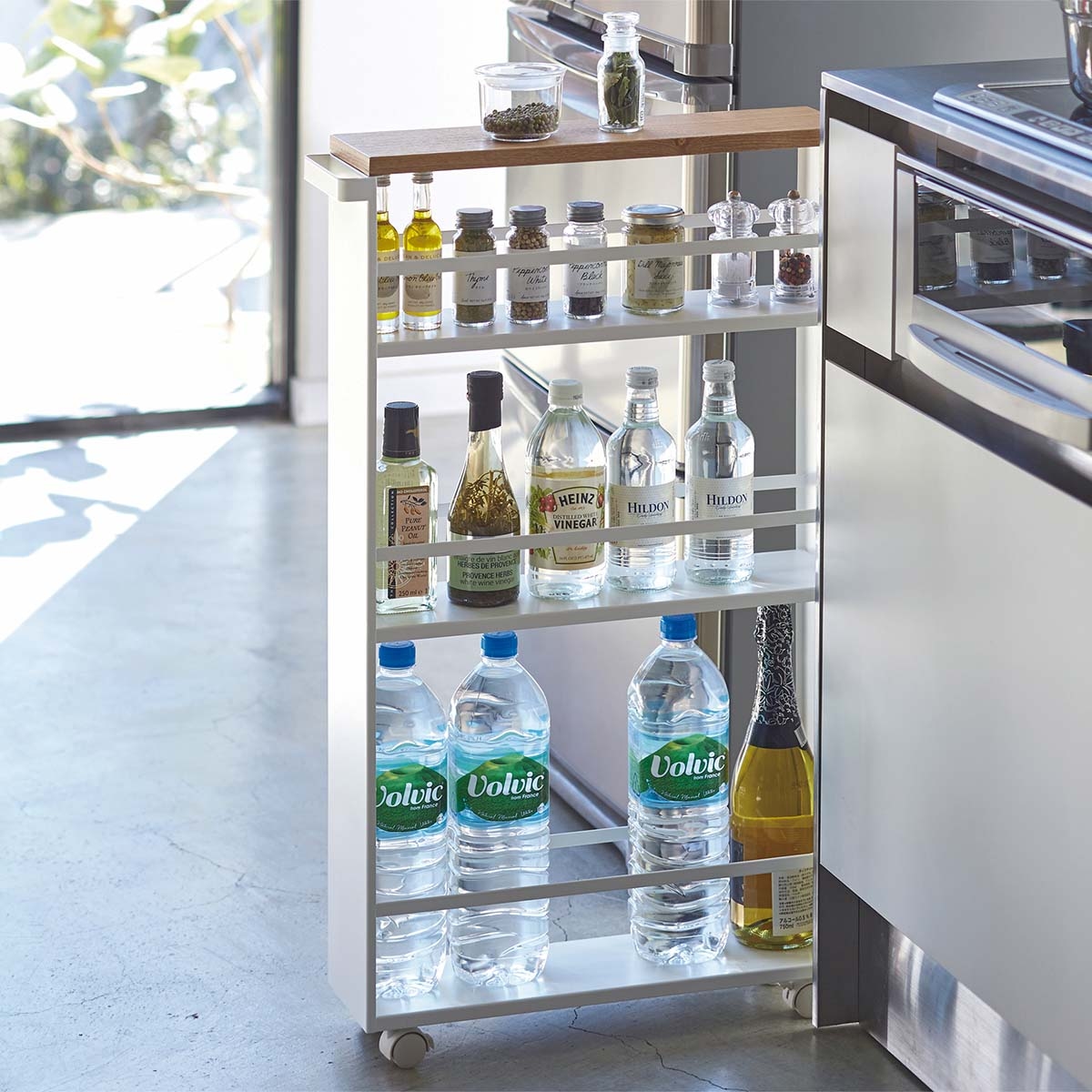 Yamazaki Home Küchenwagen Nischenwagen schmal mit Rollen weiß Rollwagen Metall 3 Ebenen und Holzablage 13x80x47cm