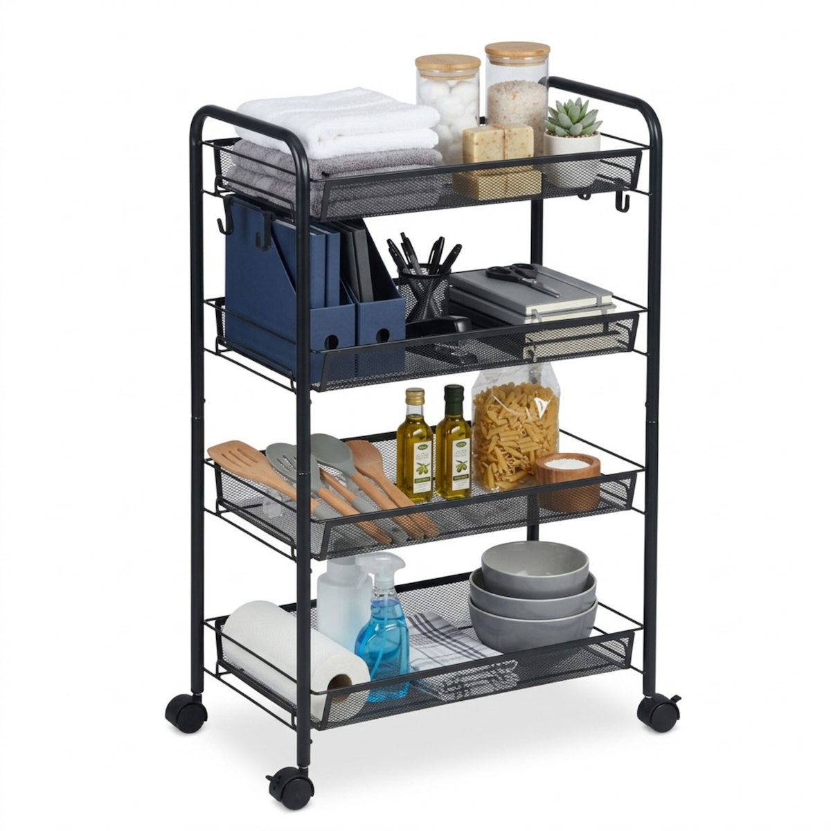 Relaxdays Rollwagen, 4 Mesh-Etagen, Servierwagen, Küchenwagen Bad & Büro, HBT 84x44,5x26 cm, Bastelwagen Metall, schwarz
