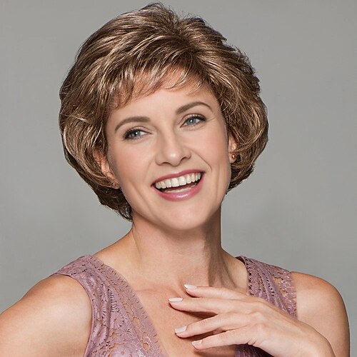 kurze gestufte brünette Perücke für Damen – Kunsthaar mit sanften Highlights, perfekt für Cosplay, Partys Alltagskleidung