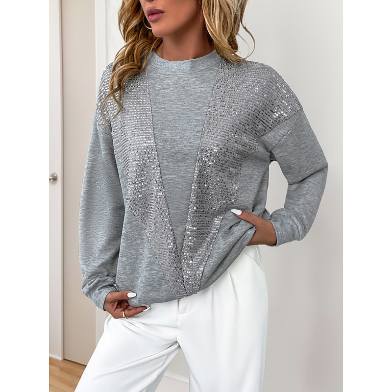 Women's Pullover Sweatshirt Plain Casual Long Sleeve Crew Neck Regular Tops Street Dailywear Casual Sequins Patchwork Gray Fall Winter
