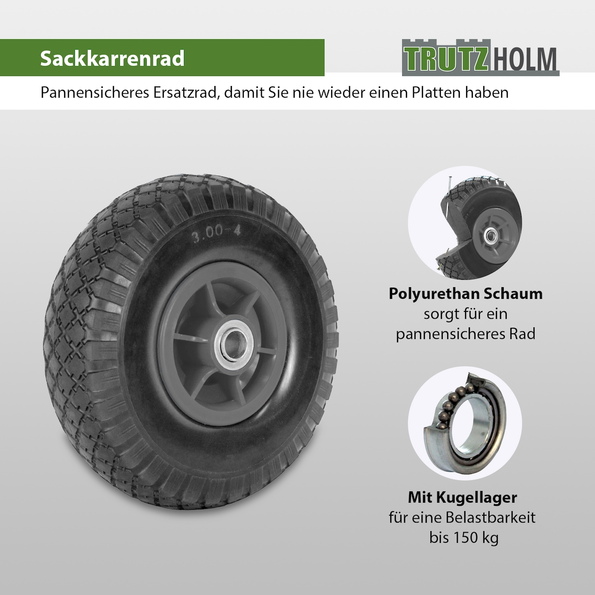 Baumarktplus 4x Sackkarrenrad PU-Rad 260x85 mm 3.00-4 75 mm zentrierte Nabe Ø 20 mm grün Vollgummi Bollerwagen