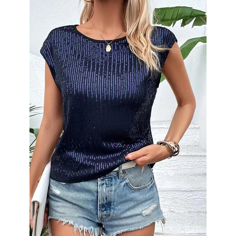 Women's Blouse Solid Color Stylish Casual Short Sleeve Crew Neck Crop Tops Daily Sequins Black Champagne Wine Royal Blue Gray Summer Spring