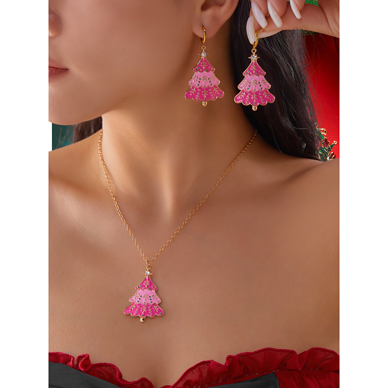 Women's Pink Christmas Tree Jewelry Set, Enamel Necklace and Earrings in Gold Tone, Festive Holiday Accessory for Winter Parties, Gifts Outfits