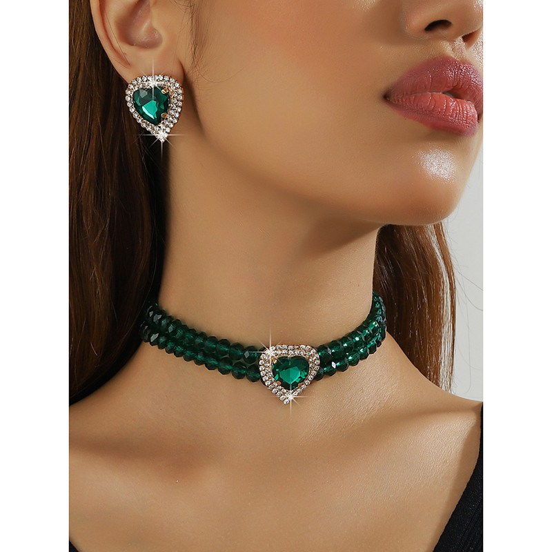 Women's Champagne Crystal Choker Stud Earrings Set, Heart-Shaped Rhinestone Jewelry, Elegant Romantic Style for Valentine's Date Night