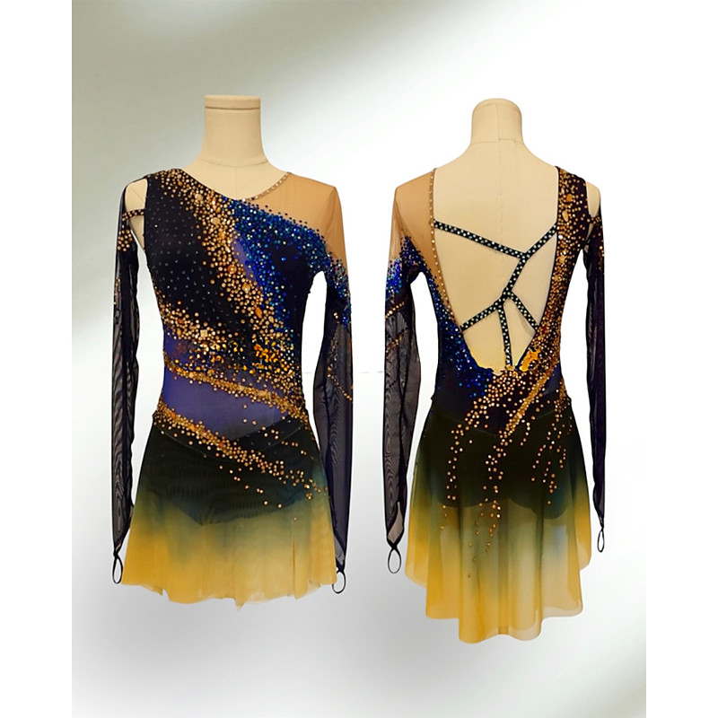 Figure Skating Dress Women's Girls' Ice Skating Dress Patchwork Asymmetric Hem High Elasticity Training Competition Skating Wear Classic Crystal / Rhinestone Long SleeveIce Skating Figure