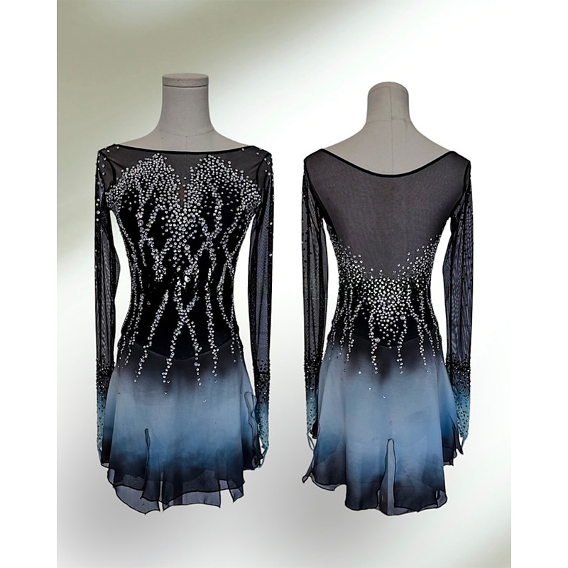 Figure Skating Dress Women's Girls' Ice Skating Dress Blue Patchwork Thumbhole Mesh Spandex Stretchy Training Practice Professional Skating Wear Crystal / Rhinestone Long Sleeve Figure Skating