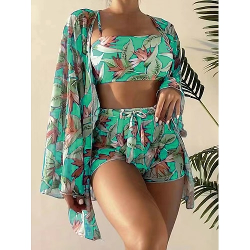 Costume da bagno bikini da donna a 3 pezzi pantaloni con palme slim senza schienale abbigliamento da spiaggia per vacanze floreale foglie scollatura a V senza maniche