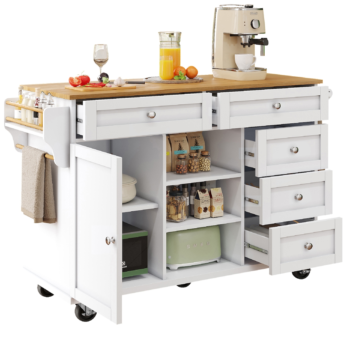 OKWISH Weiß & Natur Küchenwagen 140 x 40(65) x 89 cm mit ausziehbarer Arbeitsplatte, 5 Schubladen, Gewürzregal, Handtuchhalter & Rollen für Küche & Esszimmer