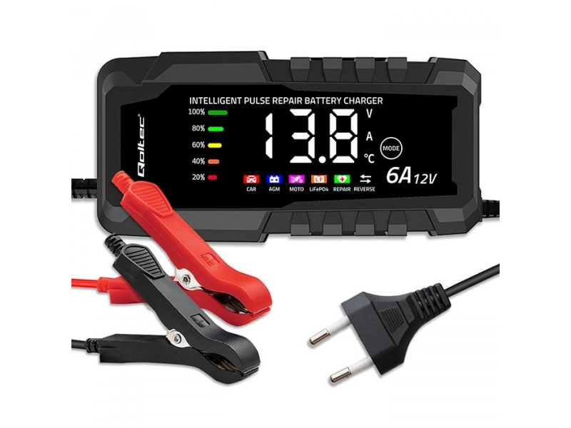 Qoltec älykäs mikroprosessoripohjainen laturi 12V 6A | Tasasuuntaaja korjaustoiminnolla AGM GEL LiFePO4-akulle | LCD-näyttö