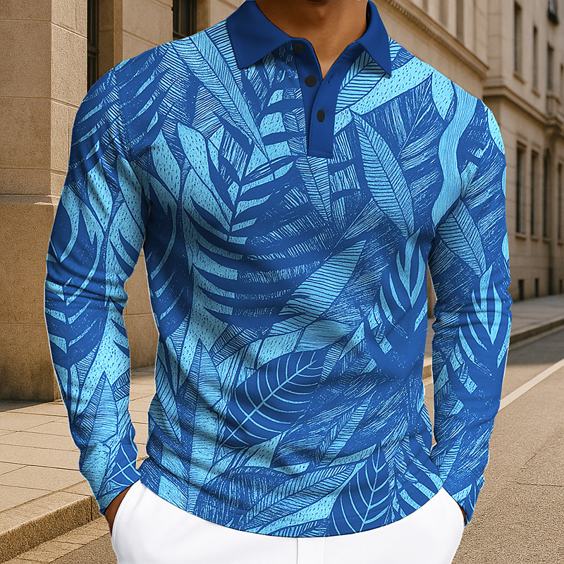 Men's Plants Leaves Polo Long Sleeve Polo Shirts Lapel Casual Athleisure Daily Wear 3D Print Buttons Spring Fall Winter Blue Green Gray